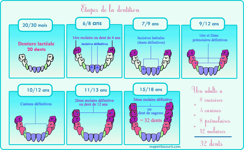 Il est important de remarquer que chaque enfant évolue à son rythme. Il ne faut donc pas s'inquiéter si les dents n'apparaissent pas dans cet ordre ou qu'elles apparaissent en avance ou en retard. Toutefois, en cas d'inquiétude, il est toujours recommandé de consulter un dentiste. |