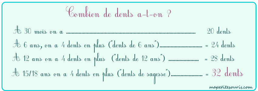 Voici un tableau qui récapitule combien de dents nous avons et les 3 phases par lesquelles tes dents vont passer : la dentition temporaire (20 dents de lait entre 0 à 3 ans), la dentition mixte (dents de lait et quelque dents définitives, entre 6 et 12/13 ans) et la dentition définitive (dents définitives, vers 15/18 ans). |